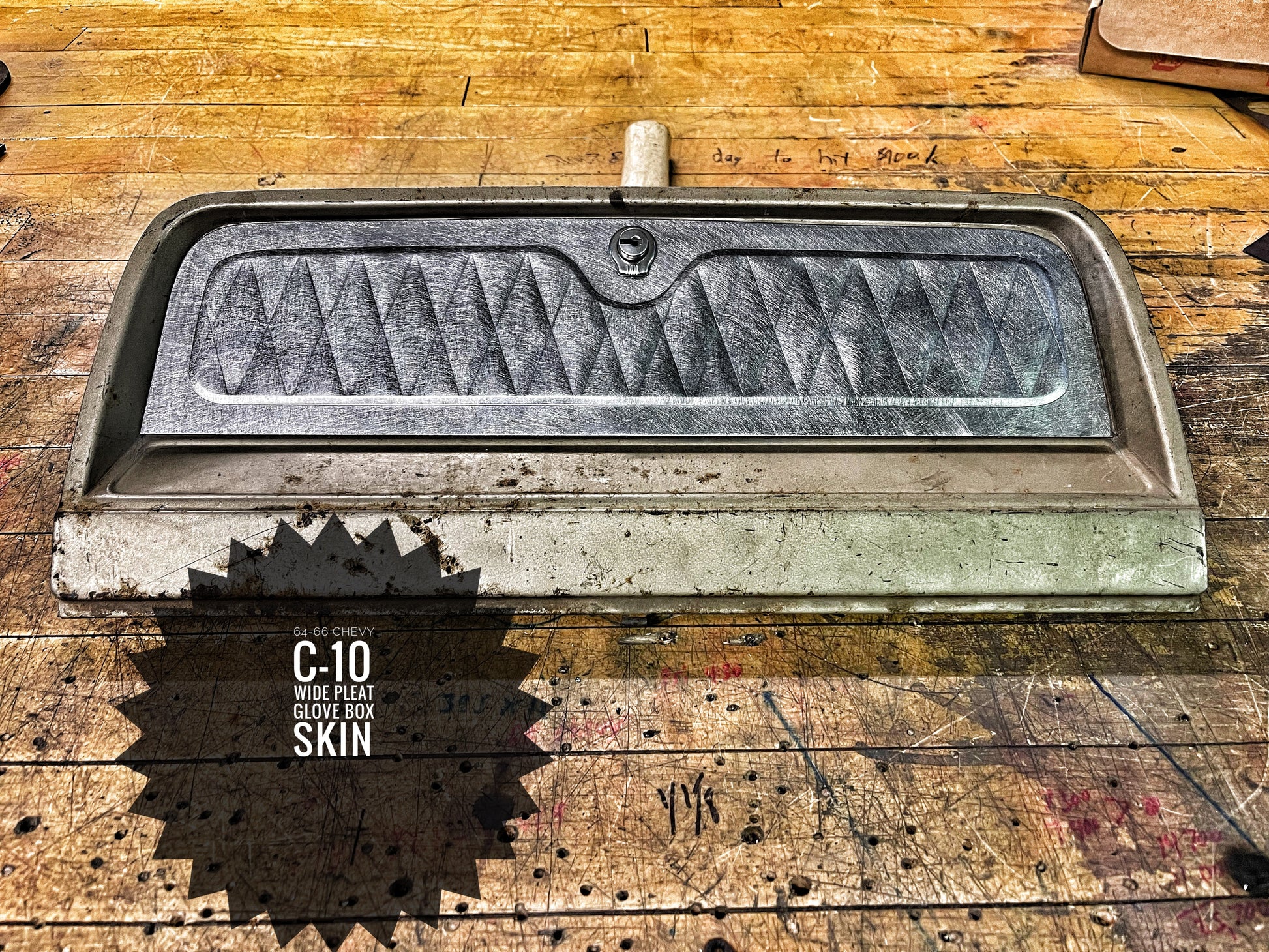 1961-1966 Chevy C-10 pleated glove box door skin . Easy way to add some appeal to that glove box area .Available in wide pleat or thin pleat design . Average leave time 4 weeks.